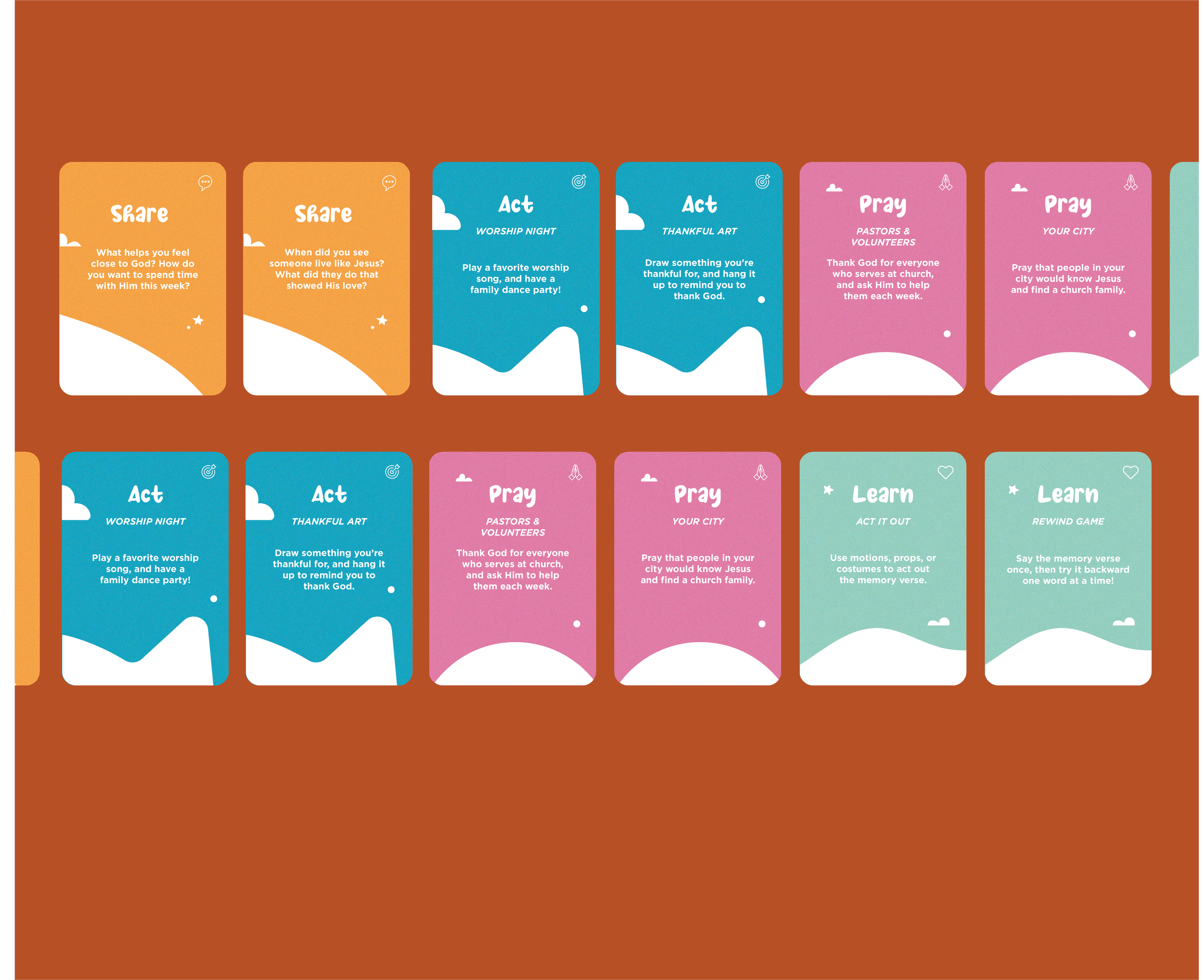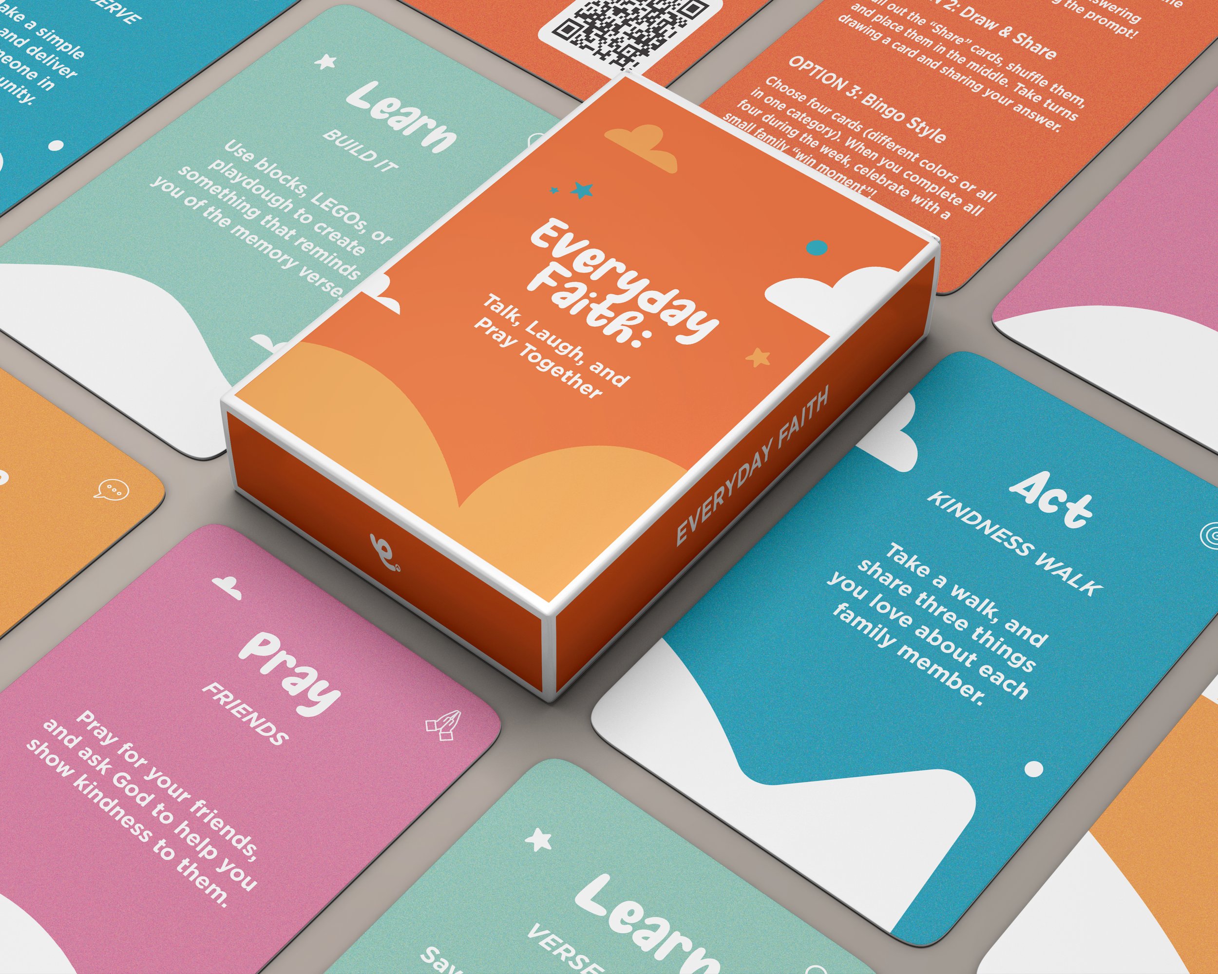 As a member of the design team, I was responsible for creating a custom deck of cards and packaging that aligned with the eKidz brand and vision, while serving as a tool to encourage hands-on activities and meaningful family experiences as they live out their everyday faith.